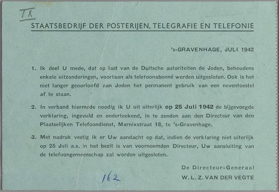 Joden mochten, 'op last van de Duitse autoriteiten' geen telefoon-abonné meer zijn.