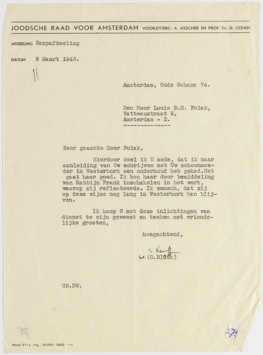 Brief van Curt Blüth aan Louis Ph. Polak m.b.t. bemiddeling functie in kamp Westerbork, 1943