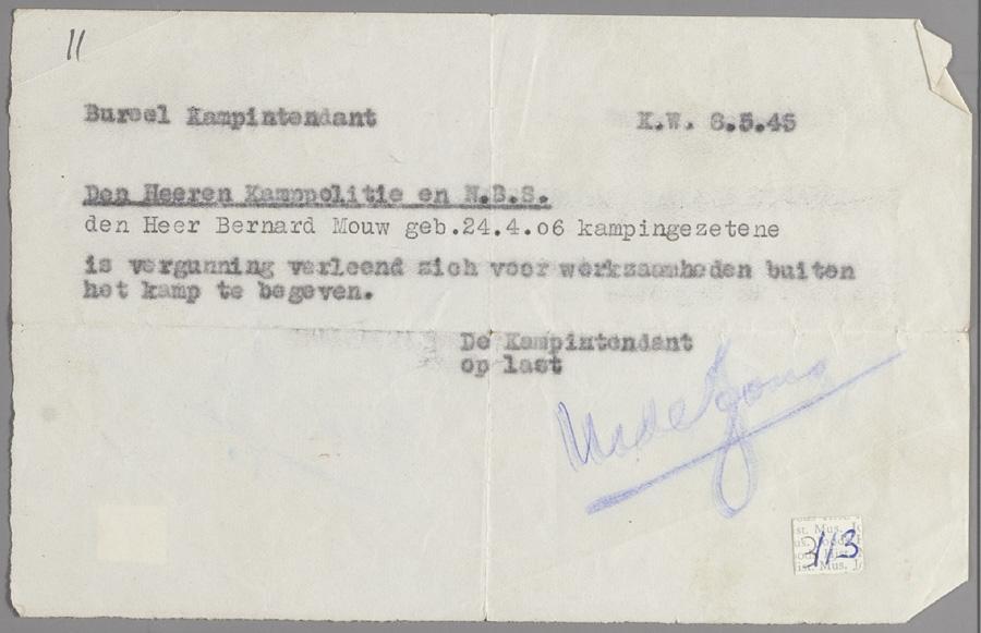 Toestemming van de kampintendant dhr. de Jong voor dhr. Bernard Mouw om zich 's avonds buiten het kamp Westerbork te begeven, 8 mei 1945