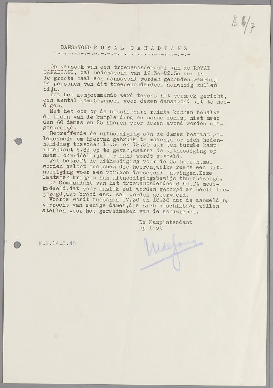 Aankondiging van een dansavond met de 'Royal Canadians', een onderdeel van de Canadese troepen. 25 mannen en 60 vrouwen uit het kamp Westerbork waren uitgenodigd voor deze avond, op 14 mei 1945