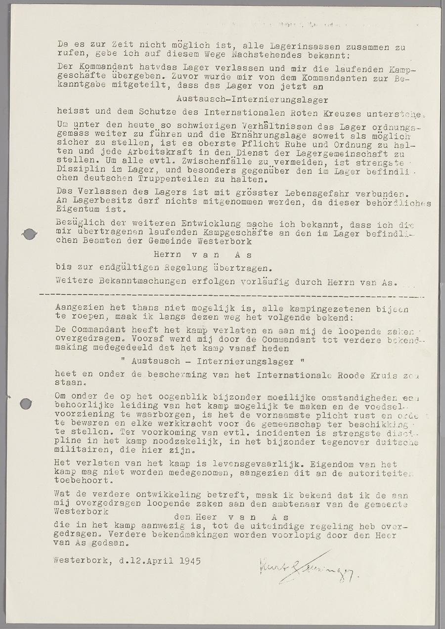Mededeling van Kurt Schlesinger over het vertrek van de Duitsers en over Aad van As als nieuwe kampcommandant, op de dag van haar bevrijding, 12 april 1945