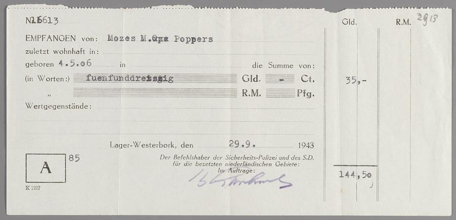 Kwitantie van kamp Westerbork voor de ontvangst van 35 gulden, op naam van Mozes Poppers, september 1943