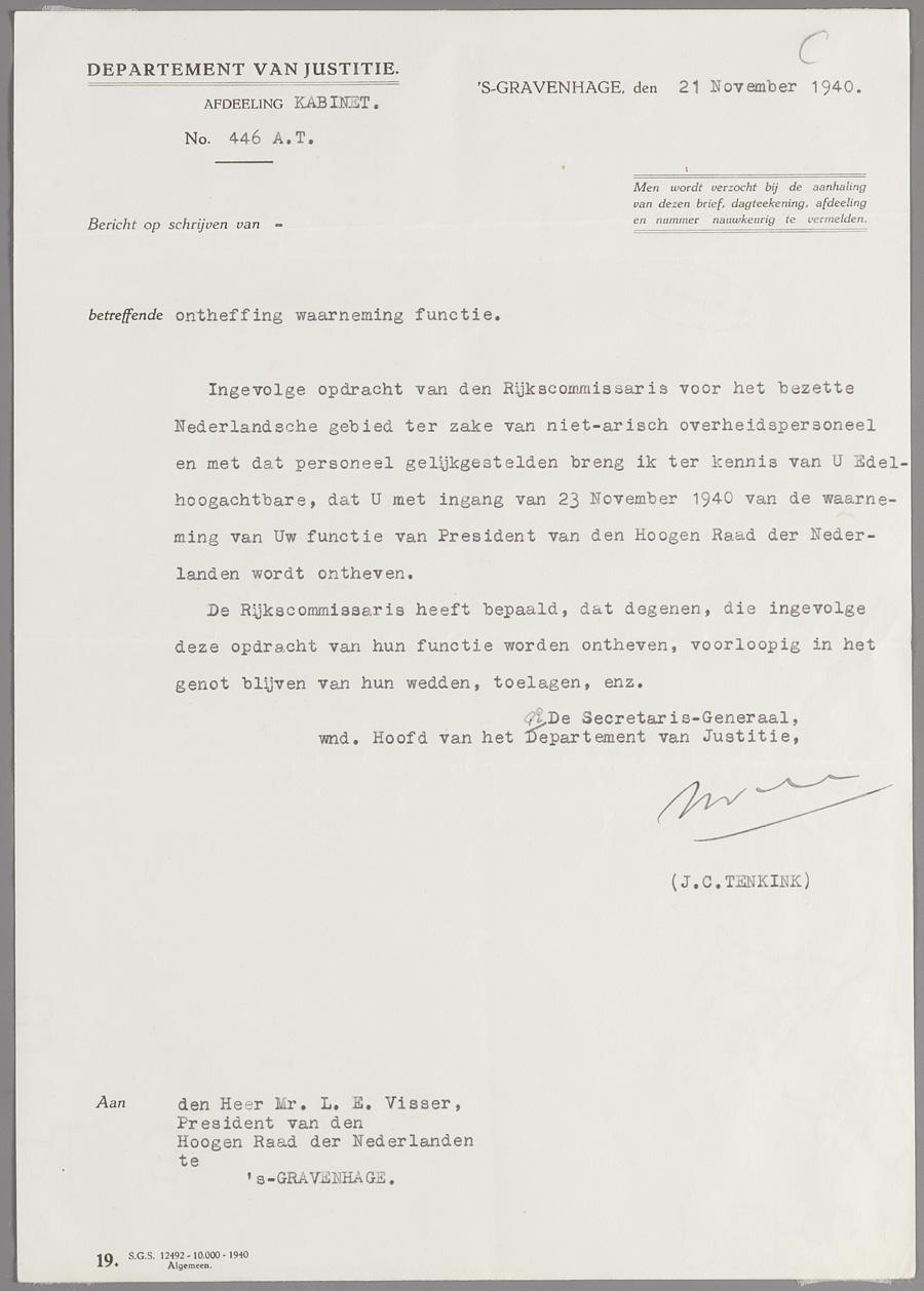 Een van de eerste anti-joodse maatregelen gold het ontslag van joods ambtenaren in november 1940. Deze maatregel trof ook zeer hooggeplaatste personen als de President van de Hoge Raad der Nederlanden, Mr. L.E. Visser. De brief bleef bewaard in het archief van Mr. Visser dat in 1986 door zijn kleindochter aan het Joods Historisch Museum werd geschonken. Hoewel slechts een eenvoudige brief, geeft dit zeer bijzonder stuk zicht op de werking van het Duitse vervolgings- en vernietigingsapparaat.