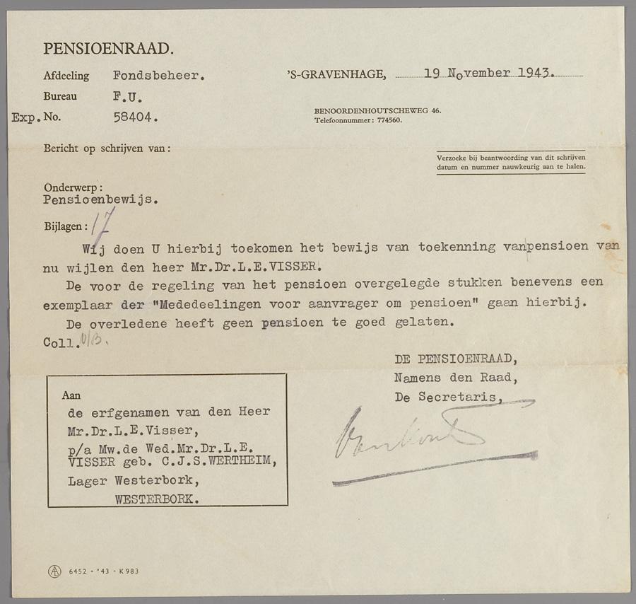 Brief van Pensioenraad, met pensioenbewijs, aan weduwe L.E. Visser in Westerbork, Den Haag, november 1943