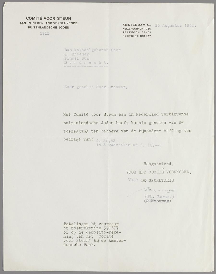 Brief voor Comite van Steun aan in Nederland Verblijvende Joden aan dhr. L. Breemer, m.b.t. finciële bijdrage, augustus 1940