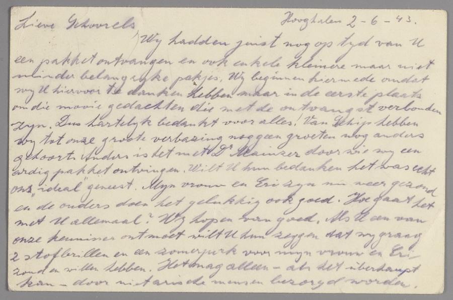 Briefkaarten (3) van Ludwig Scharlach in Westerbork aan voormalige buren fam. S. Schoorel in Amsterdam, juni-juli 1943