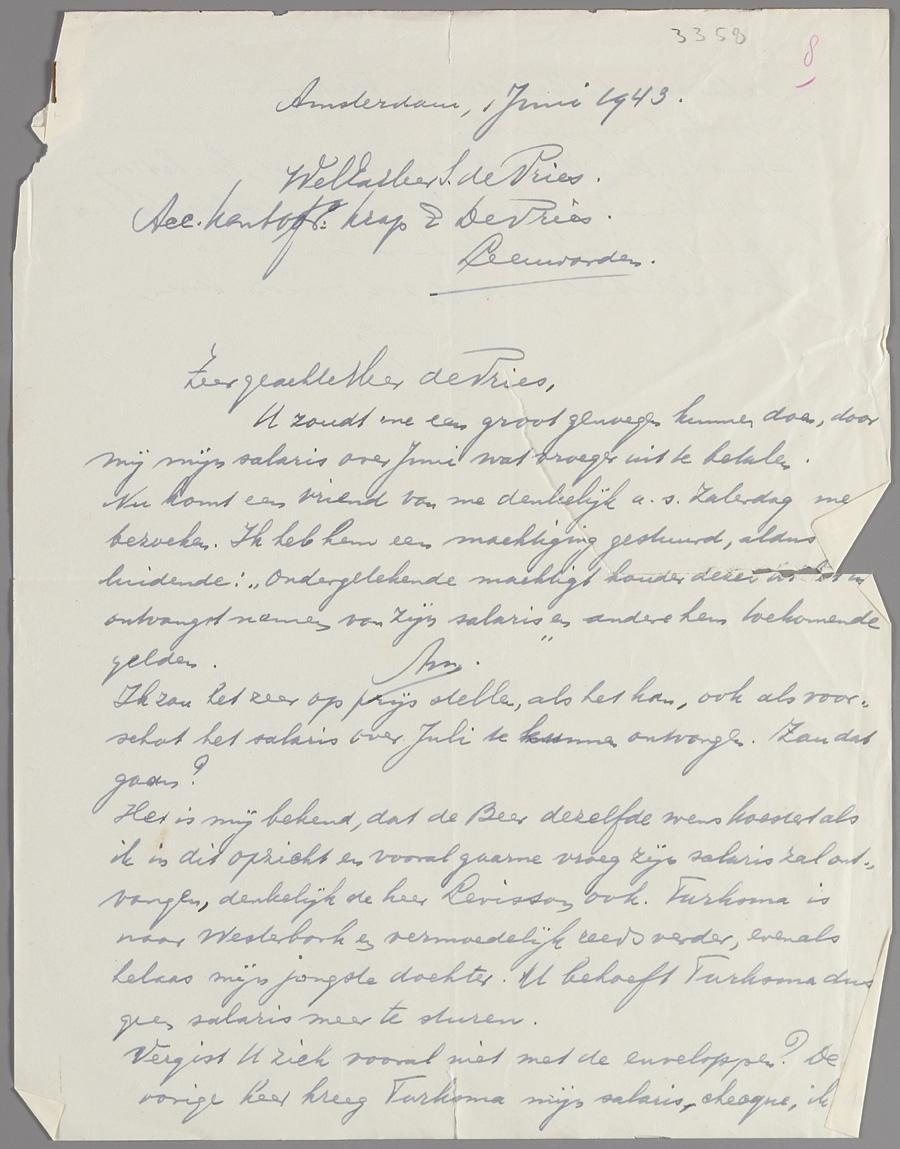 Briefschrijver (naam onleesbaar) verzoekt om een voorschot op het salaris en heeft iemand gemachtigd het loon voor hem te ontvangen, e.e.a. met aanstaand 'vertrek'. Zijn jongste dochter is al naar Westerbork, zijn oudste dochter werkt in het ziekenhuis in Leeuwarden.