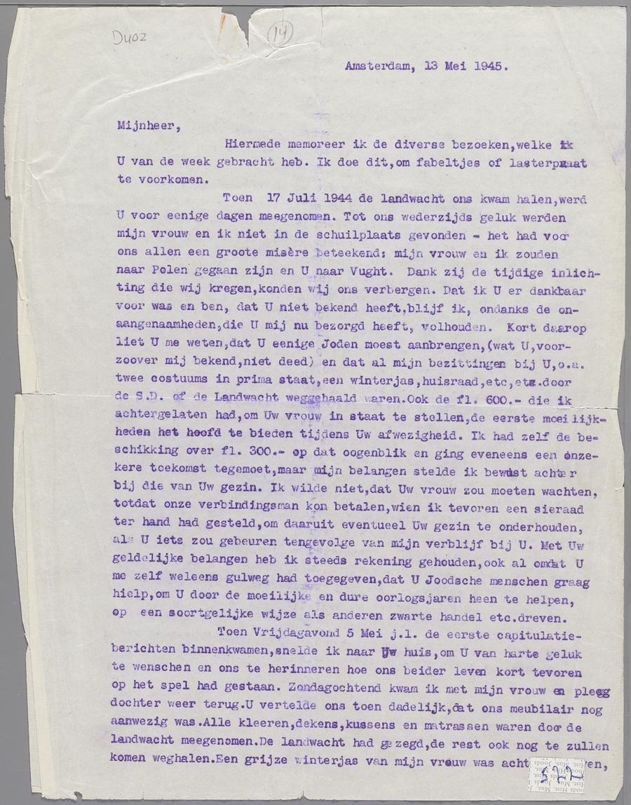 Brief van een onderduiker aan de man die hem, zijn vrouw en pleegdochter onderdak bood maar alle bezittingen van de ondergedoken familie confisceerde, mei 1945