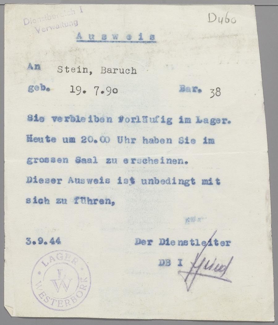 Oproep voor Bernhard Stein om in de grote zaal van het kamp Westerbork te verschijnen, september 1944