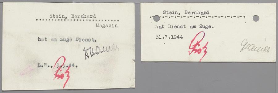 Werkbriefje uit Westerbork op naam van Bernhard Stein, met de tekst "Stein, Bernhard hat dienst am Zuge", 1944