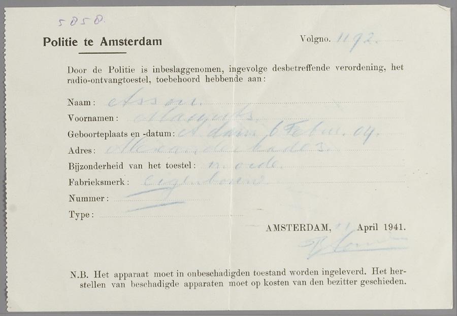 Bewijs van inlevering radiotoestel bij de politie te Amsterdam, op naam van Maurits Assou, april 1941