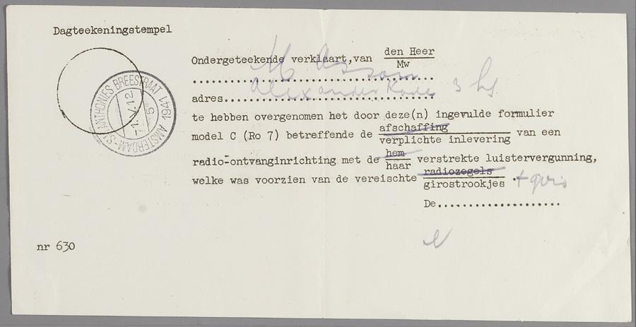 Verklaring van verplichte inlevering radiotoestel en luistervergunning, op naam van maurits Assou, 1941