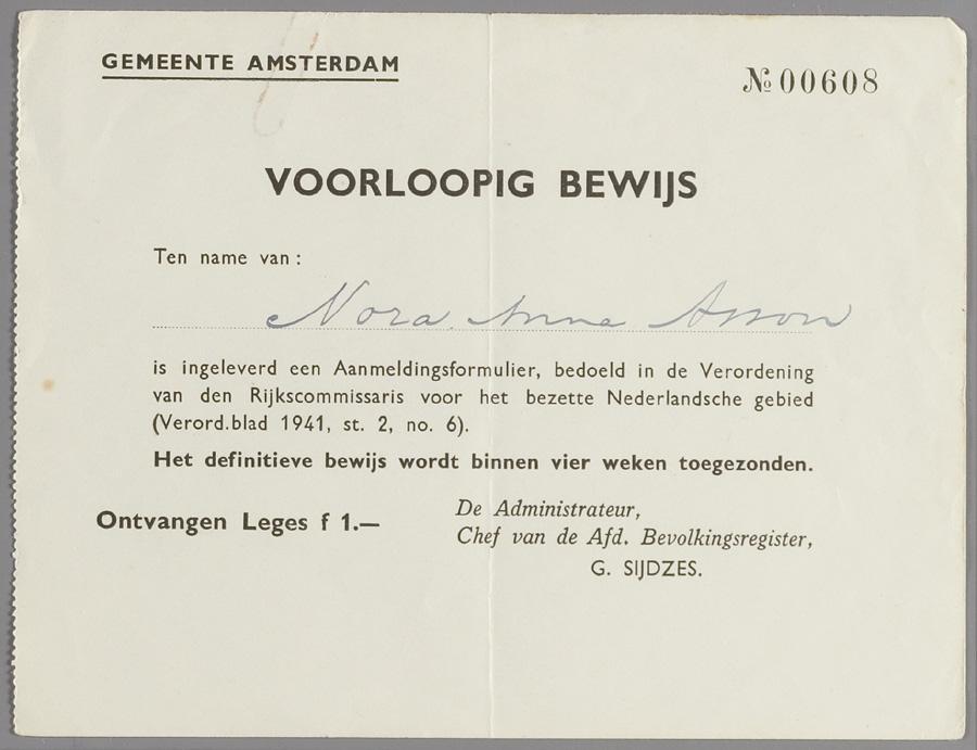 Voorlopig bewijzen van aanmelding (2) op naam van Maurits Assou en zijn dochter Nora Anna Assou, 1941