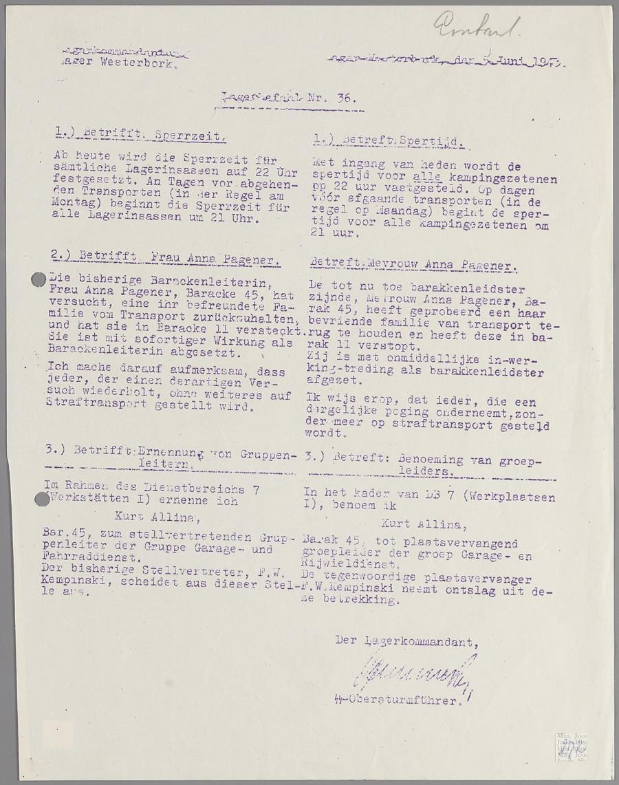 Lagerbefehl nr. 36 betref de spertijd, het ontslag van mevr. Anna Pagener als barakkenleidster omdat zij een bevriende familie had verstopt; de benoeming van Kurt Allina tot plaatsvervangend groepleider van de groep Garage- en Rijwieldienst in de afdeling Werkplaatsen I (Dienstbereich 7) - hij volgde F.W. Kempinski op.