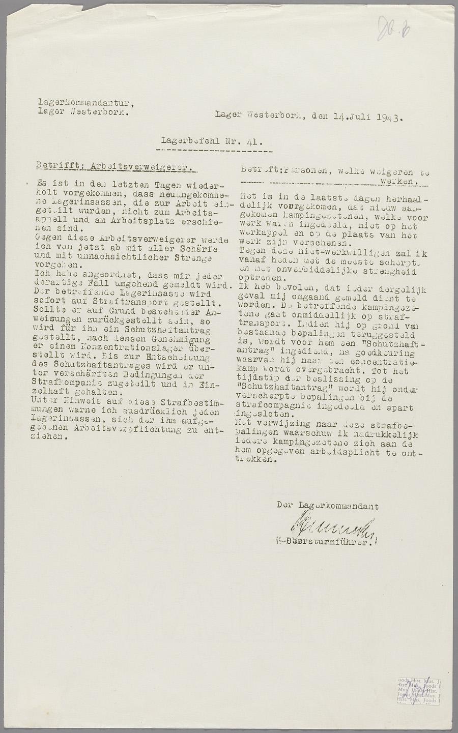 Lagerbefehl nr. 41 van kamp Westerbork, juli 1943