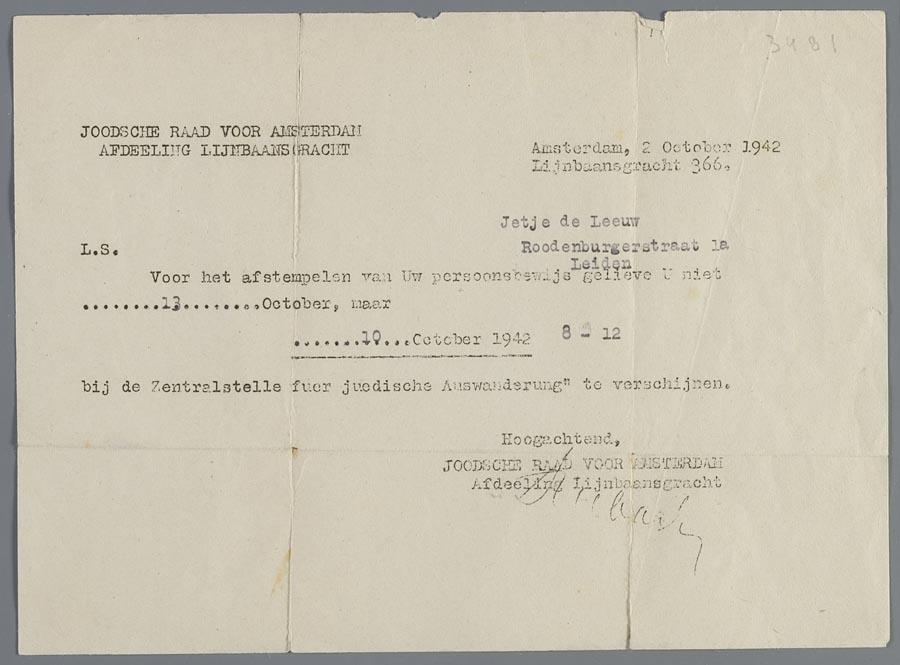 Mededeling van de Joodse Raad m.b.t. persoonsbewijs van Jetje de Leeuw, 1942