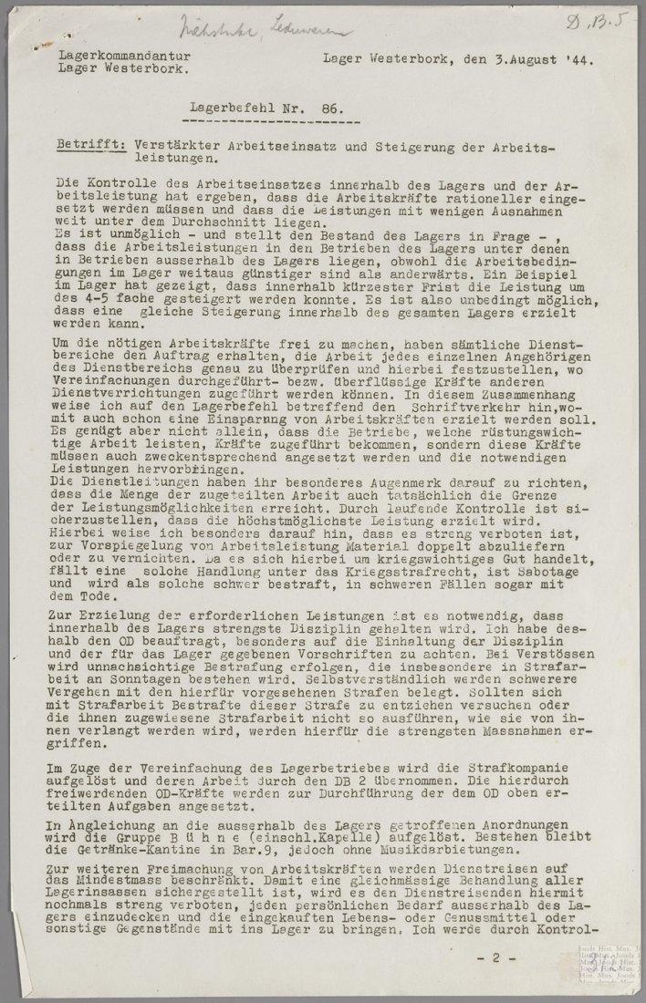 Lagerbefehl nr. 86 uit Westerbork betreft o.a. de 'vermeerdering van arbeidskrachten en verhoging der arbeidsprestaties' en allerlei daaraan gekopelde strafmaatregelen. De opheffing van de strafcompagnie als dusdanig, en haar opname in Dienstbereich 2 werd medegedeeld.