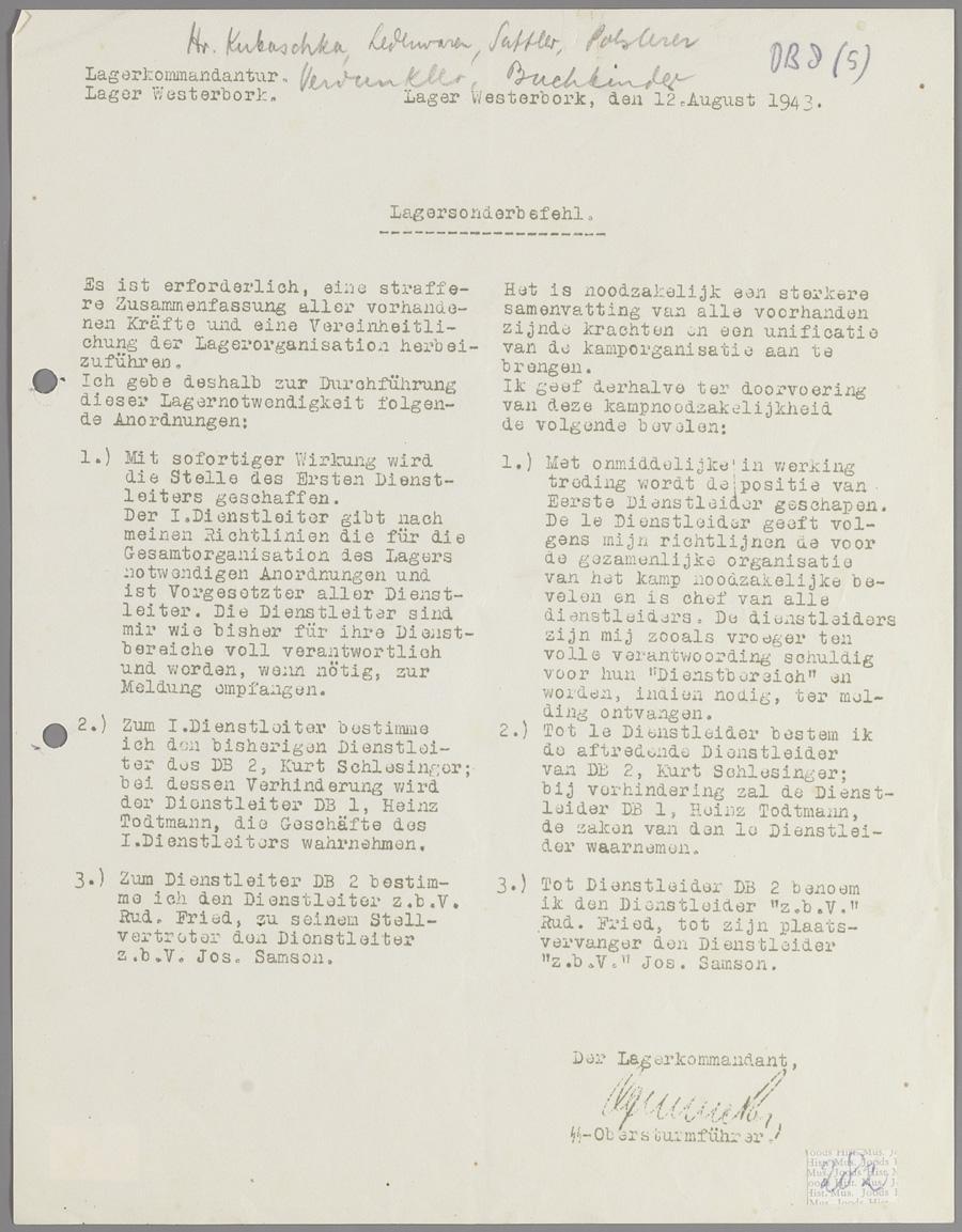 Lagersonderbefehl, kampverordening van kamp Westerbork, zonder nummer, over een verandering in de kamporganisatie, augustus 1943