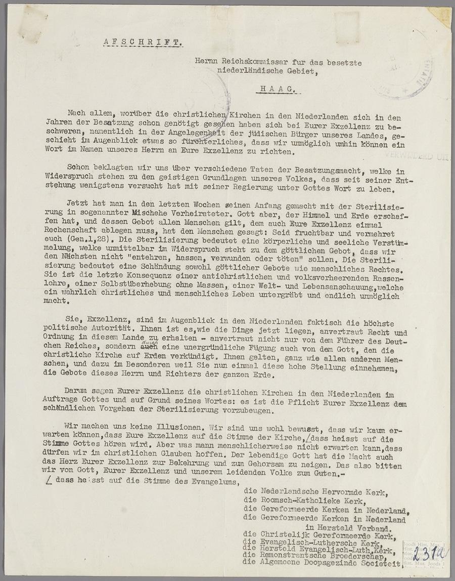 Protestbrief van Nederlandse kerken tegen deportatiemaatregelen en sterilisatie, 1942