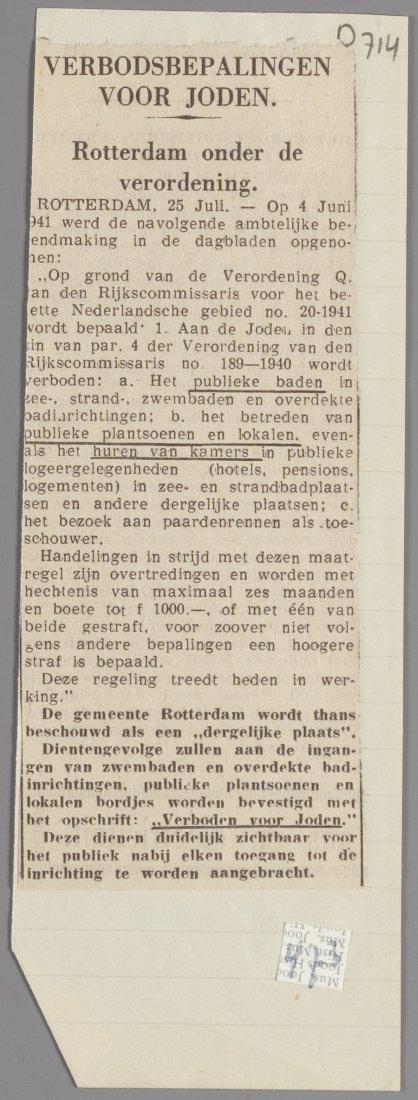 Krantenknipsel met de publicatie van een verordening voor joden met allerlei verbodsbepalingen, o.a. het betreden van publieke plaatsen, juli 1941