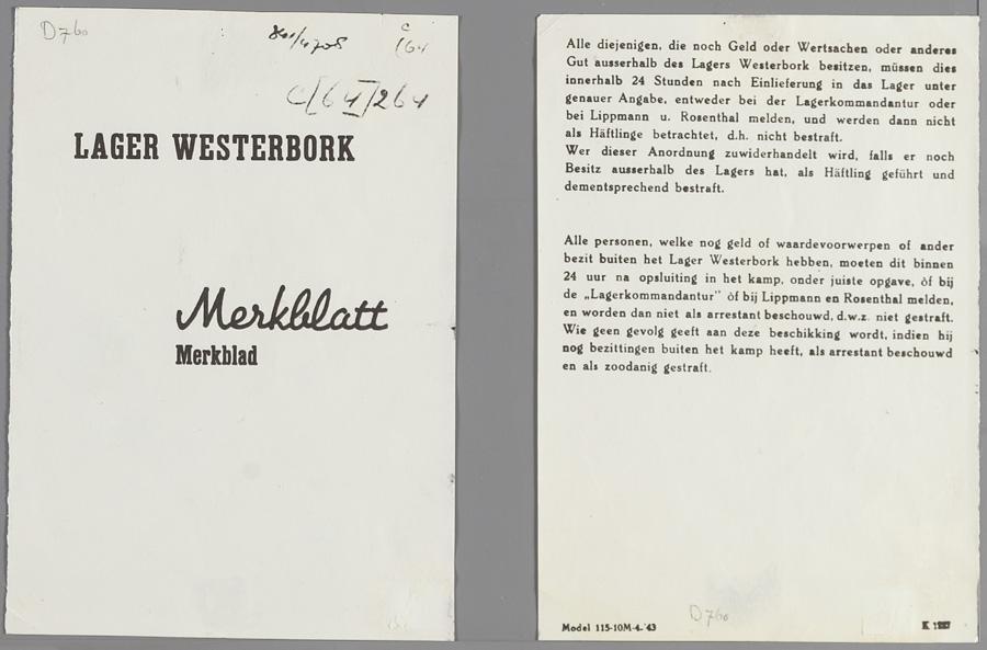 'Merkblatt' van kamp Westerbork waarin kampingezetenen wordt gewaarschuwd voor strafmaatregelen als zij nog geld en andere waardevoorwerpen buiten het kamp bezitten, 1943