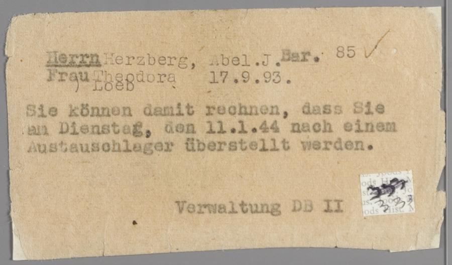 De afdeling Verwaltung (Dienstbereich II) van het kamp Westerbork deelt aan Abel J. Herzberg en zijn echtgenote Theodora Loeb mee dat ze er op moeten rekenen dat ze mee moeten met een aanstaand transport naar een "Austauschlager" op 11 januari 1944. Herzberg en zijn vrouw Theodora Herzberg-Loeb werden inderdaad op 11 januari 1944 naar Bergen-Belsen gedeporteerd met een transport van 1037 personen.