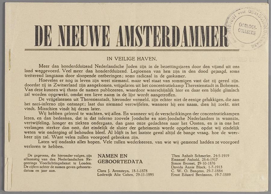 "In veilige haven" luid de kop van dit stuk uit de Nieuwe Amsterdammer, waarin een lijst met namen van circa 400 overlevenden uit Theresienstadt wordt gepubliceerd. 'De vrijgelatenen uit Theresienstadt, hieronder vermeld, zijn echter niet de eenige gelukkigen, die aan het nazi-inferno zijn ontsnapt; laat dus niemand vertwijfelen, wanneer hij een naam, dien hij zoekt, niet vindt. Misschien vindt hij dezen later. Wij hebben geleerd te wachten, wij allen. En wanneer wij de verschrikkingen der concentratiekampen lezen, en dan bedenken, dat in dat inferno zoovele joodsche en niet-joodsche Nederlanders in waanzin, vertwijfeling, honger en ziekten ondergaan, dan gaan onze gedachten naar het Oosten, en is in ons het verlangen sterker dan ooit, dat eindelijk de sluier der geheimenis worde opgeheven, opdat wij eindelijk weten wie onderging of behouden bleef. Al blijft in het laatste geval altijd de bange vraag, hoe de weerkeer zijn zal. Want velen zullen voorgoed gebroken zijn. Laten wij ondanks alles hopen. Vele zullen wederkeeren, van wie wij gemeend hadden ze voorgoed verloren te hebben'.