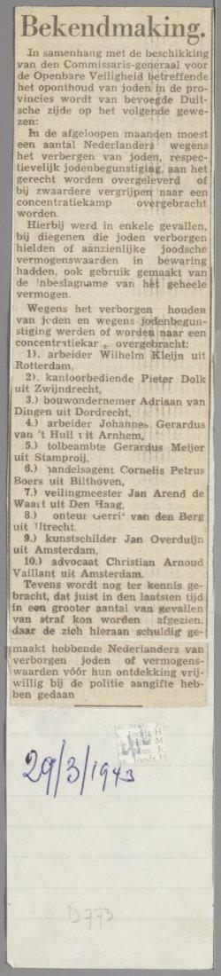Krantenknipsel met bericht over 10 mensen die door de Duitsers gevangen zijn genomen omdat zij joden hielpen (bijvoorbeeld met onderduik), 29 maart 1943