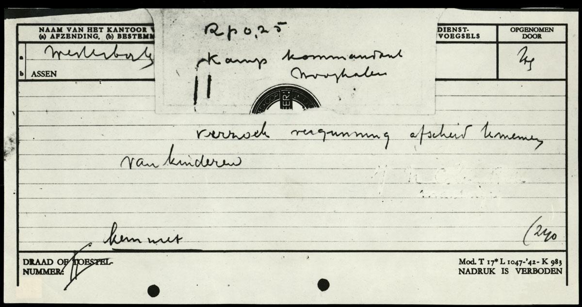 Telegram (kopie) met verzoek tot vergunning om afscheid te nemen van kinderen, Kamp Westerbork