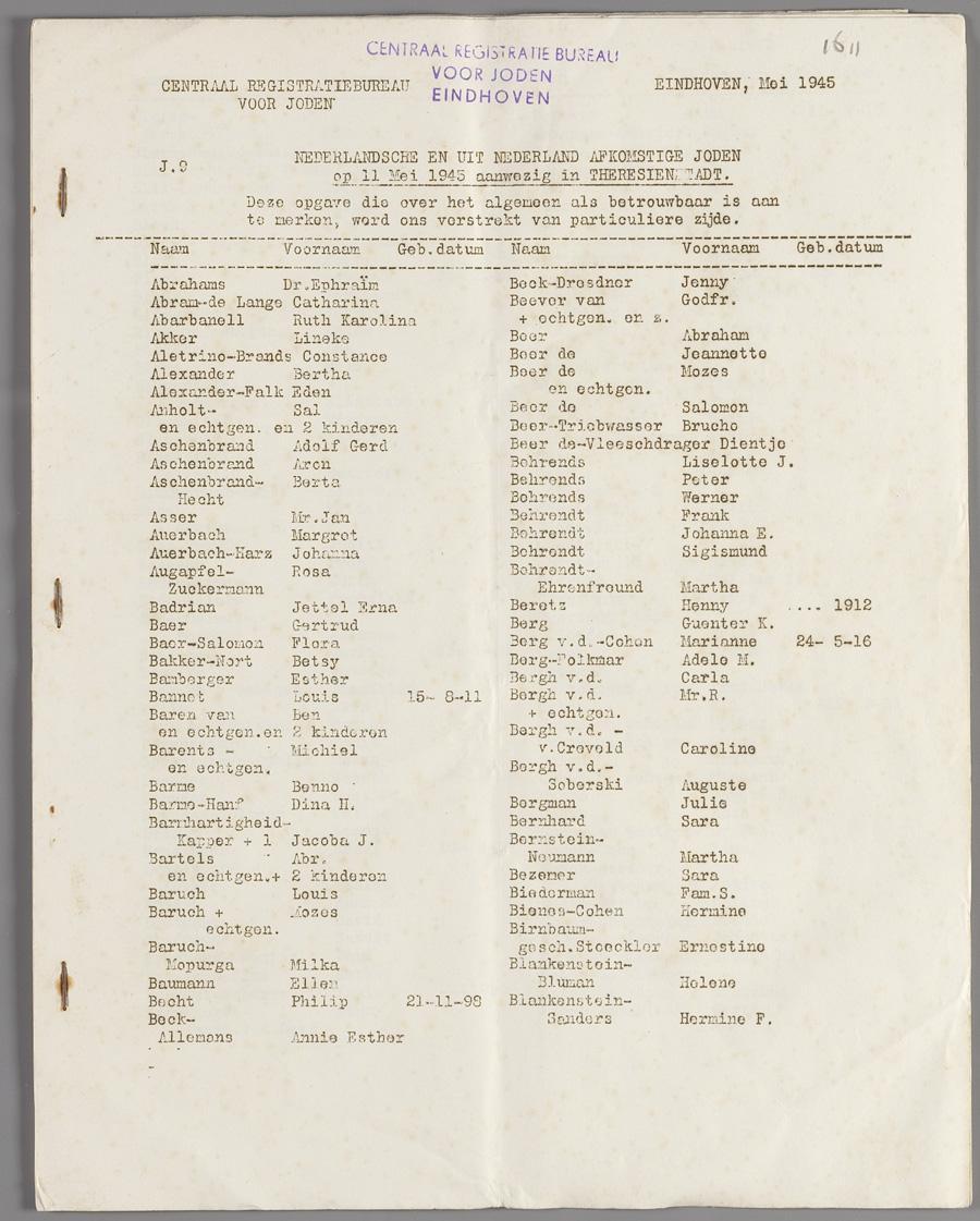 Naamlijst met Nederlandse en uit Nederland afkomstige joden op 11 mei 1945 aanwezig in Theresienstadt