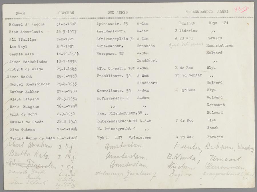 Naamlijsten van ruim 30 joden die in Friesland ondergedoken hebben gezeten, met onderduikadressen