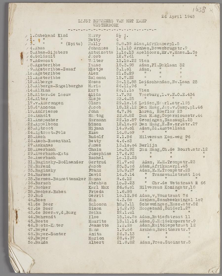 Lijst (15 p.) met naam, geboortedatum en voormalig adres van 742 bewoners van het kamp Westerbork, 26 april 1945.