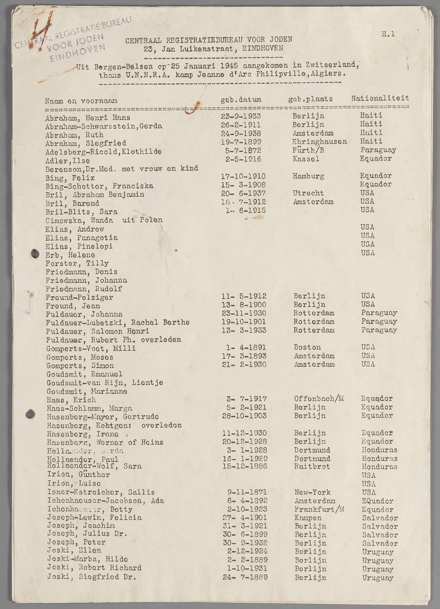 Lijst (4 p.) van uit Bergen-Belsen in Zwitserland aangekomen personen, uitgegeven door het Centraal Registratiebureau voor Joden, 1945