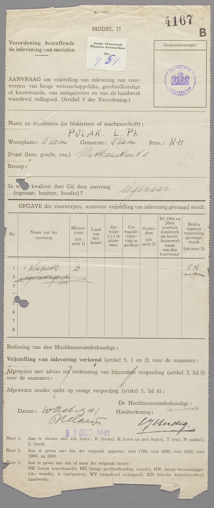 Aanvraagforrmulier ingevuld door Louis Ph. Polak om, voor een plaquette, vrijstelling te krijgen van de inleveringsplicht van metalen, oktober 1941