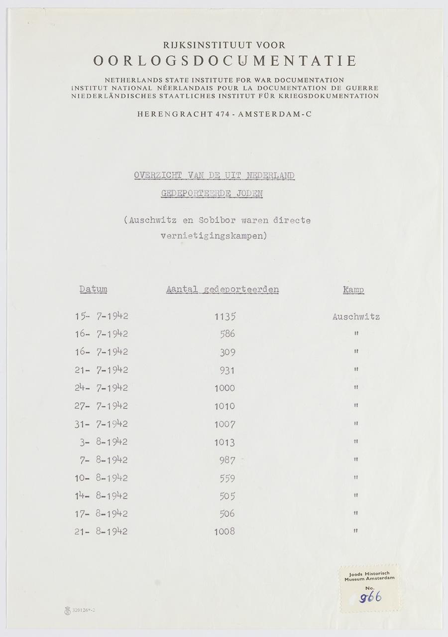 Overzicht, opgesteld door Ben Sijes van het RIOD, met de transporten vanuit Nederland naar de kampen, met begeleidende brief, 1964