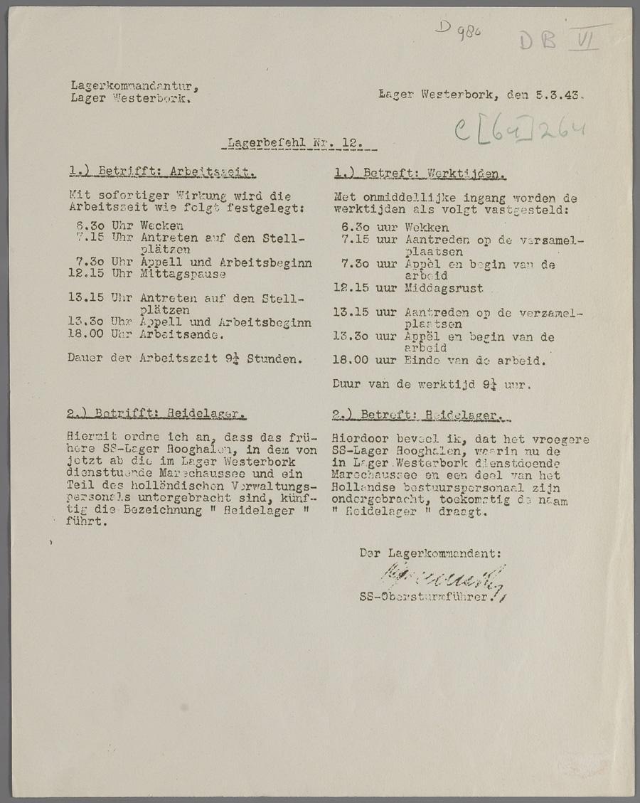 Lagerbefehl nr. 12, betreffende werktijden en Heidelager, 1943