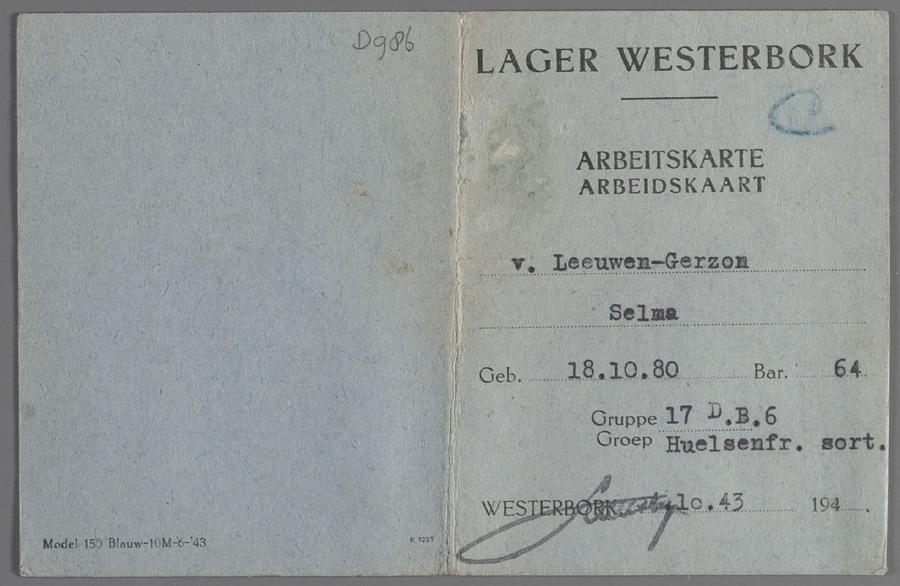 Op naam van Selma van Leeuwen-Gerzon gestelde arbeidskaart, Westerbork, oktober 1943