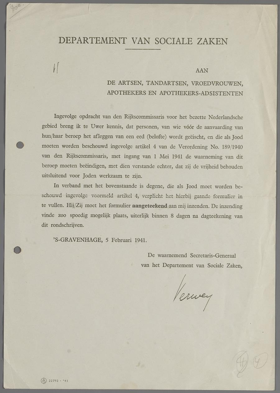 Circulaire van het Departement van Sociale zaken aan artsen, tandartsen, vroedvrouwen en apothekers over het verbod per 1 mei 1941, om als jood hun beroep uit te oefenen, februari 1941