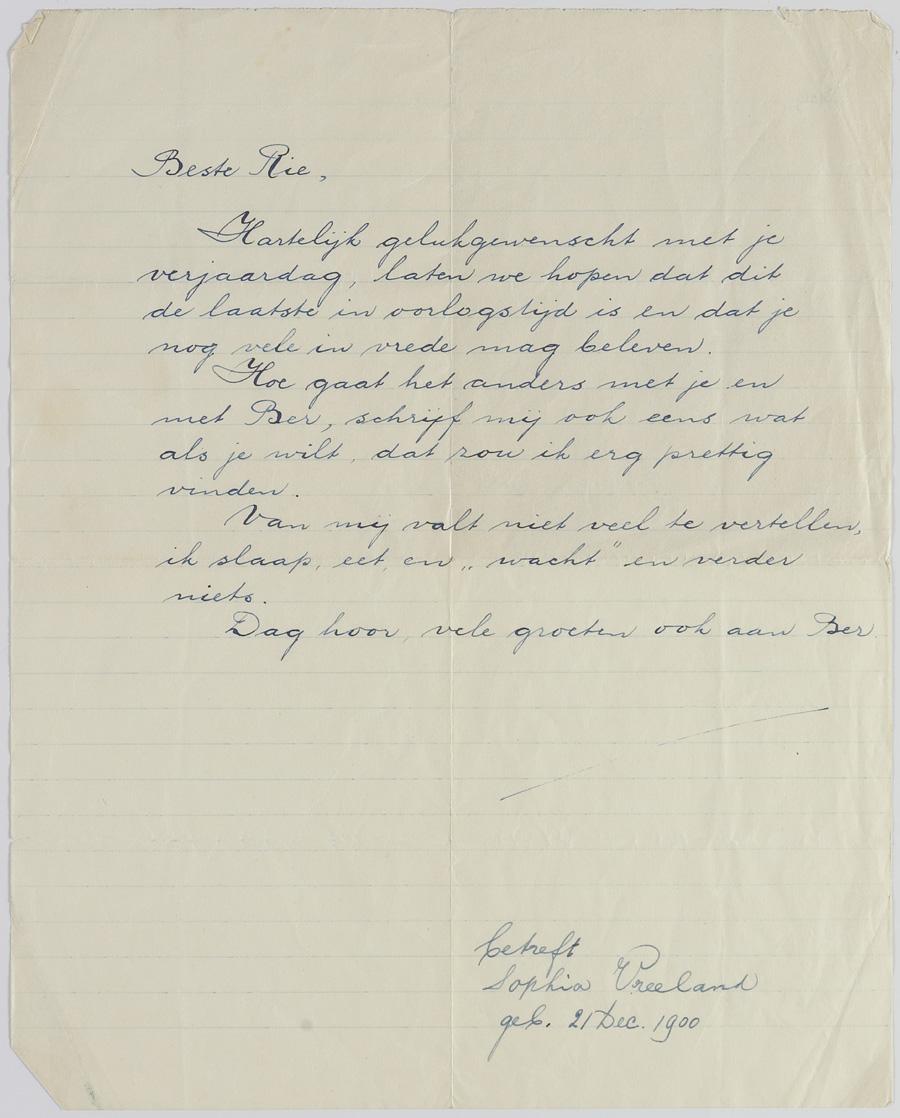 Brief van Sophia Vreeland uit Westerbork aan vriendin Rie Hidskes