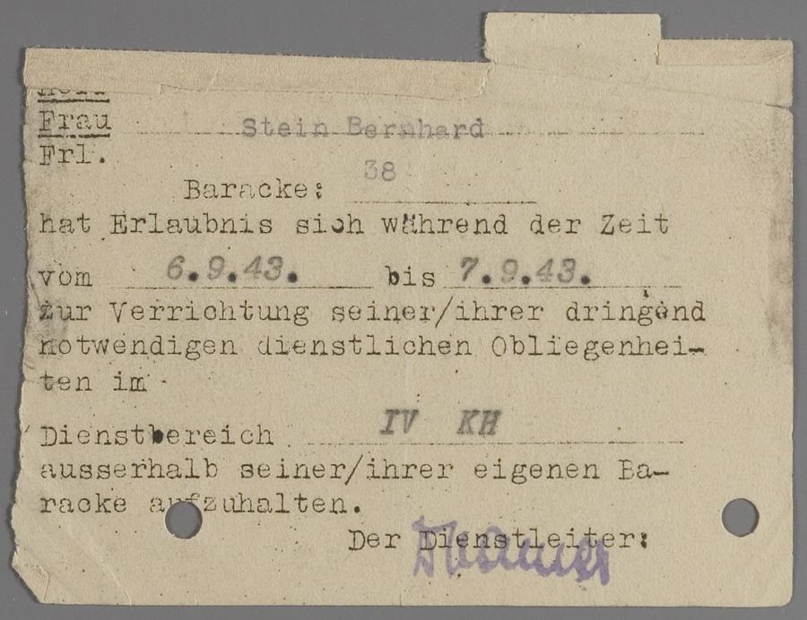 Vergunning uit Westerbork, op naam van Bernhard Stein, waarmee hij zich van 6 tot 7 september 1943 buiten de eigen barak mocht begeven, in verband met te verrichten werkzaamheden, september 1943