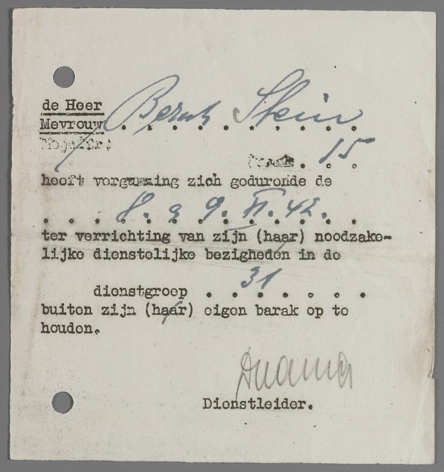 Vergunning uit Westerbork, op naam van Bernhard Stein, waarmee hij zich buiten de eigen barak mocht begeven, november 1942