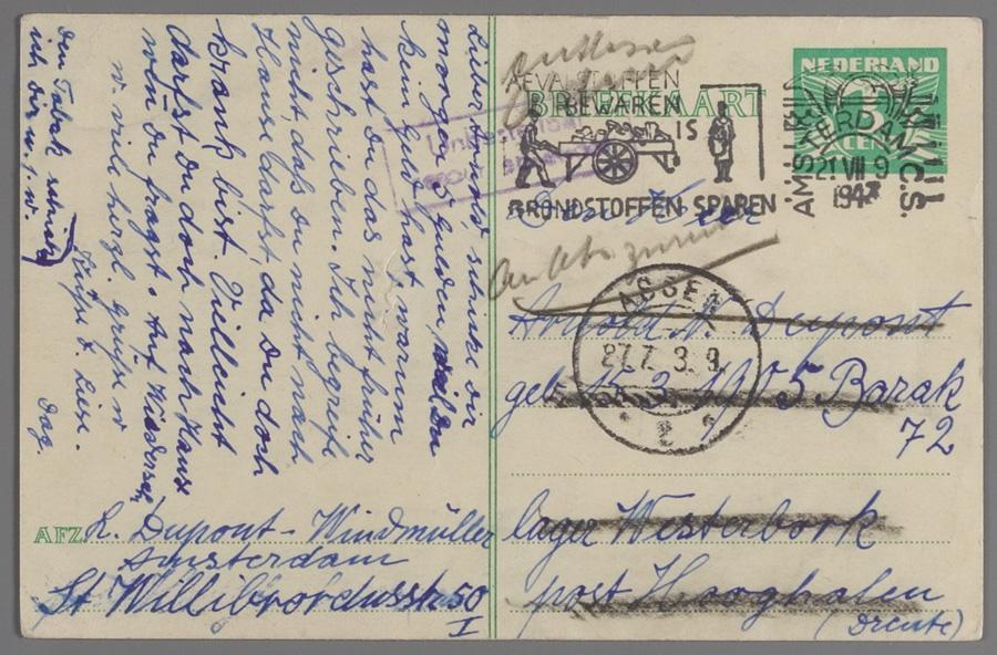 Briefkaart van Lisette Windmüller in Amsterdam aan echtgenoot Arnold Dupont in Westerbork, 1943
