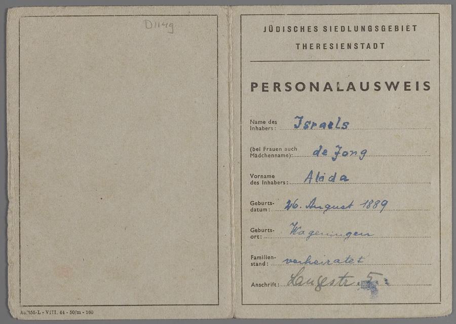Identiteitsbewijs ('Personalausweis') uit Theresienstadt, op naam van Aleida Israels-de Jong, afgestempeld op 1 januari 1945