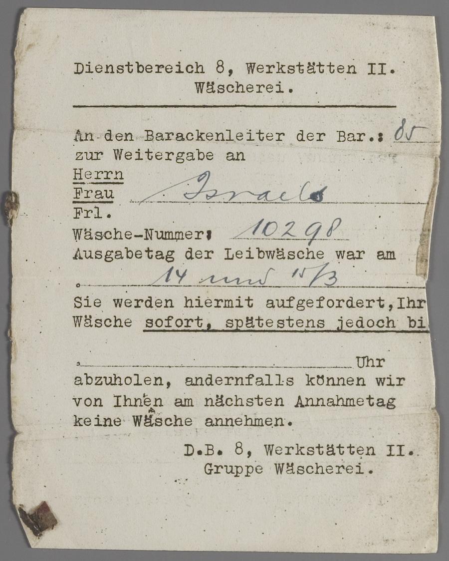Mededeling voor Sander Israels, om ingeleverde was af te halen in de wasserij van Westerbork, 1943-1944