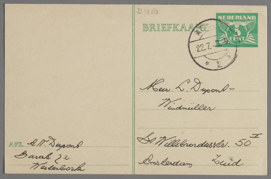 Briefkaart van Arnold Dupont in Westerbork aan zijn vrouw Lisette Dipont-Windmüller in Amsterdam, met dank voor toegezonden pakket, juli 1943