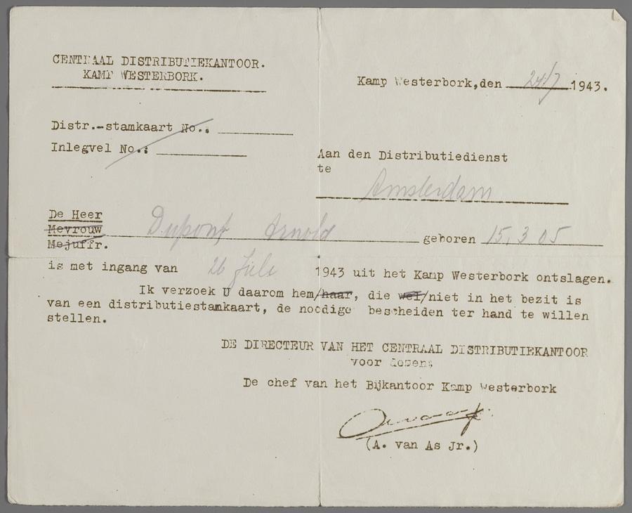 Mededeling van het Centraal Distributiekantoor Westerbork dat Arnold Dupont op 26 juli uit kamp Westerbork werd ontslagen, met het verzoek hem van distributiepapieren te voorzien 1943
