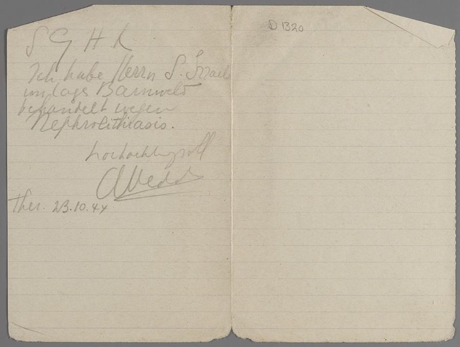 Mededeling van arts betreffende behandeling van S. Israels, Theresienstadt, oktober 1944