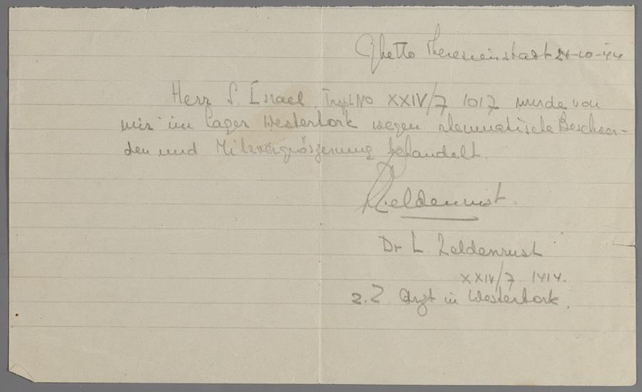 Verklaring van arts L. Zeldenrust in Thersienstadt over behandeling van Sander Israels in Westerbork, oktober 1944
