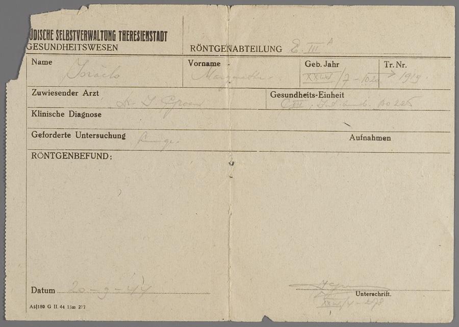 Briefje met verwijzing voor longarts, op naam van Margeretha Israels in Theresienstadt, september 1944