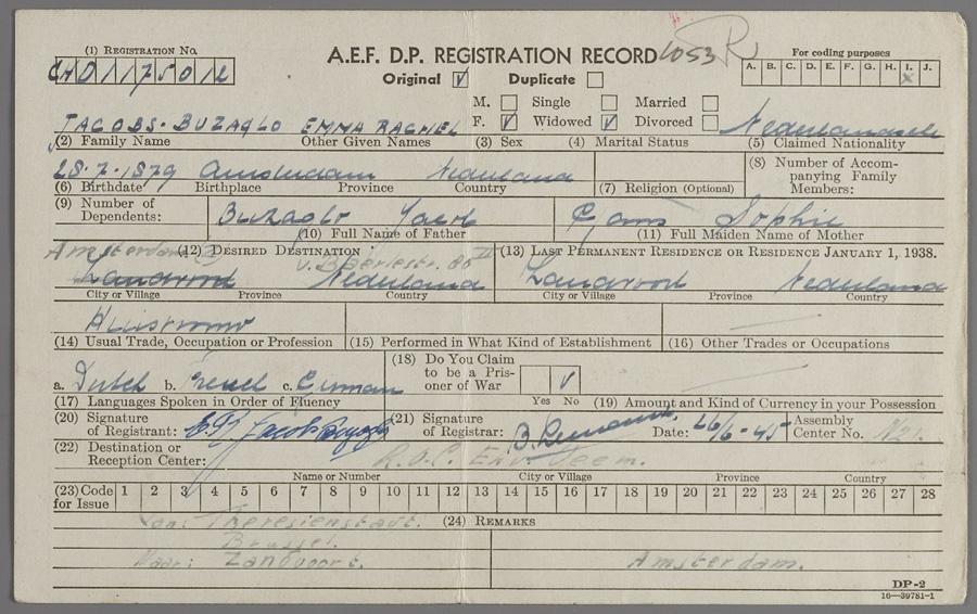 Registratiekaart van de Allied Expeditionary Force op naam van Emma Rachel Jacobs-Buzaglo, juli 1945